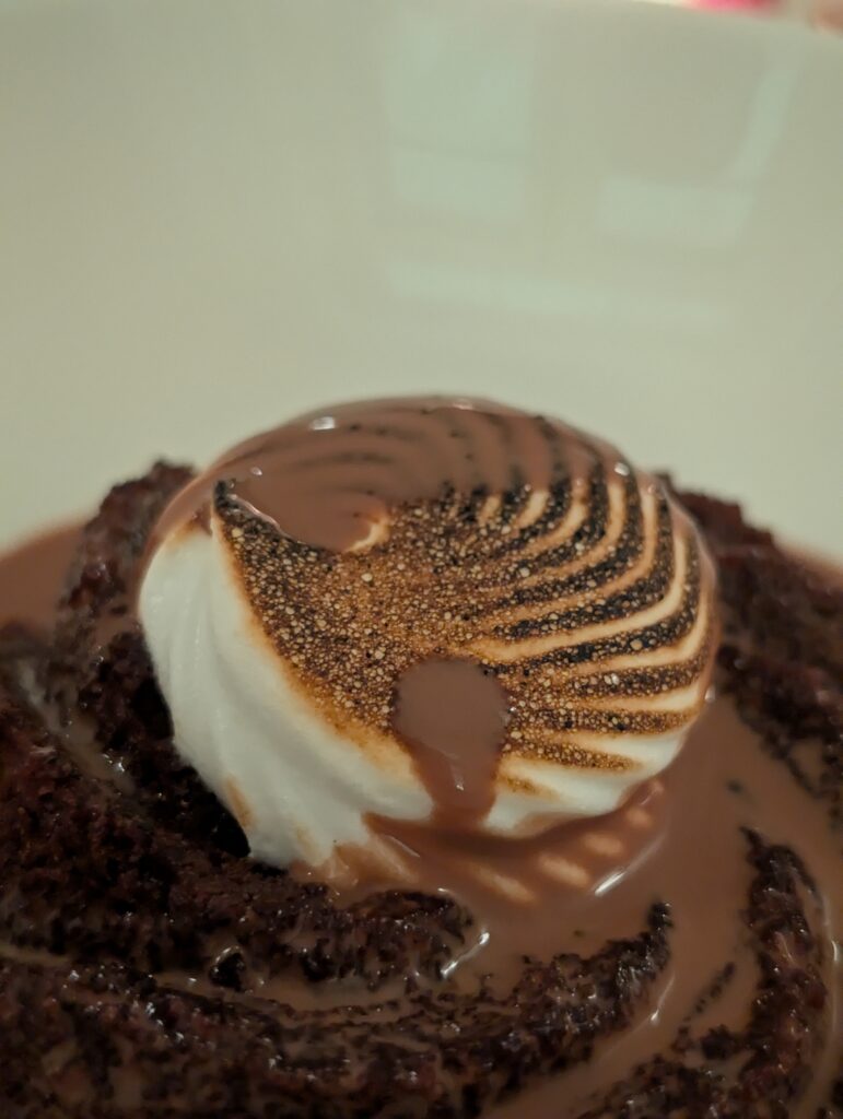 We finished with two incredible desserts: the Eggnog Crème Brûlée, which had a perfect thick candied top, and the Chocolate Cake, featuring a rich, tableside chocolate pour. Highly recommended for a special night out!